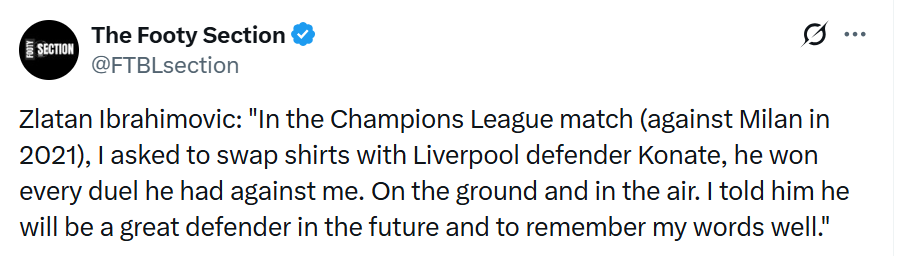 伊布拉希莫维奇称赞“伊布”-科纳特,神奇的故事——近日,瑞典巨星伊布在接受采访时谈到了利物浦中卫、法国国脚伊布拉希马-科纳特。